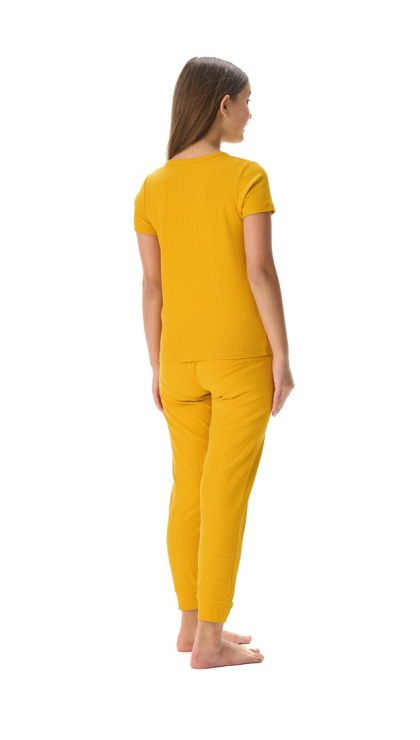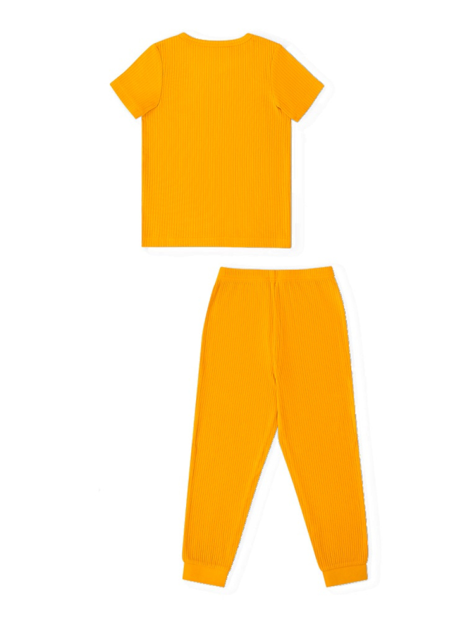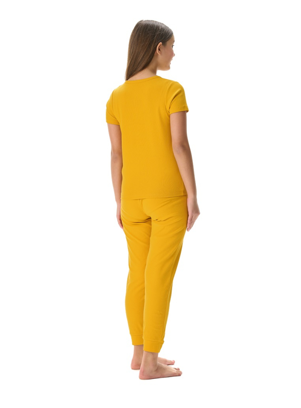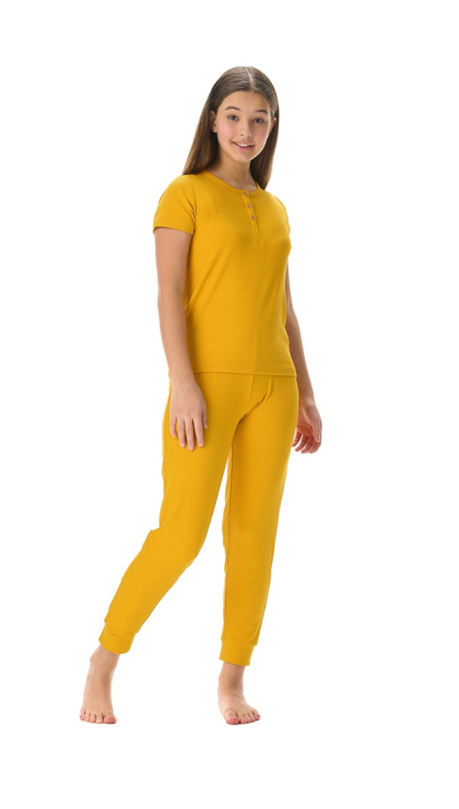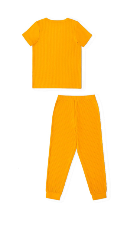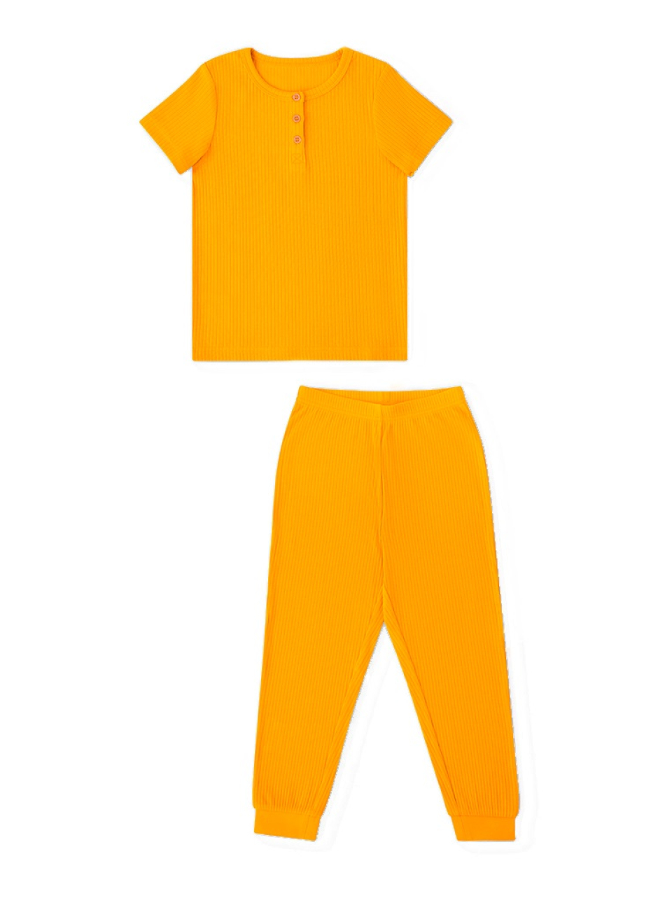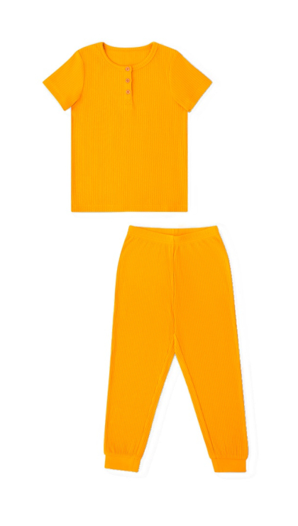 Конструктивные особенности: ● Пижамный комплект ● Короткий рукав ● Округлый вырез горловины с застежкой на пуговицы ● Брюки на резинке ● Эластичное полотно в рубчик