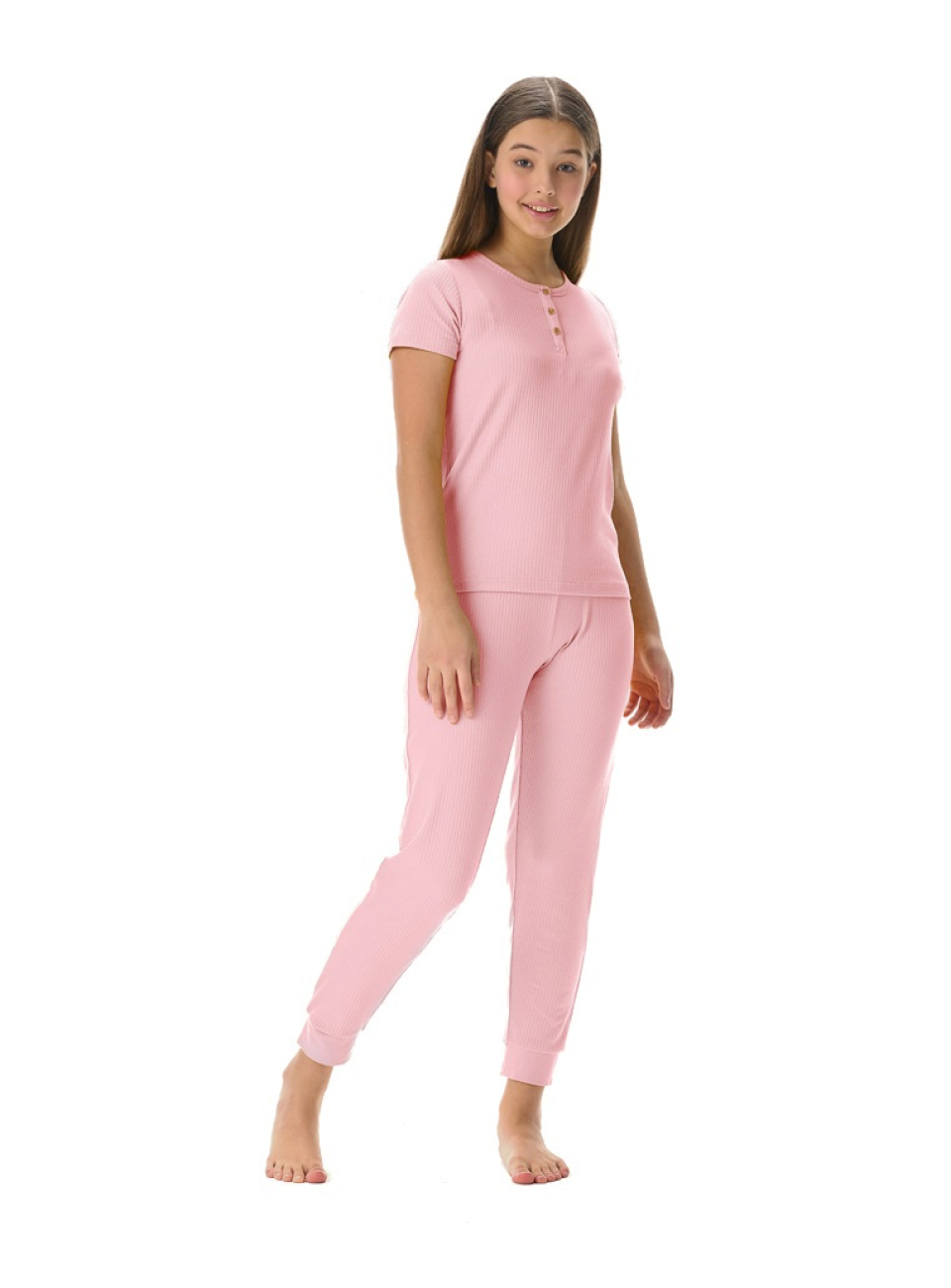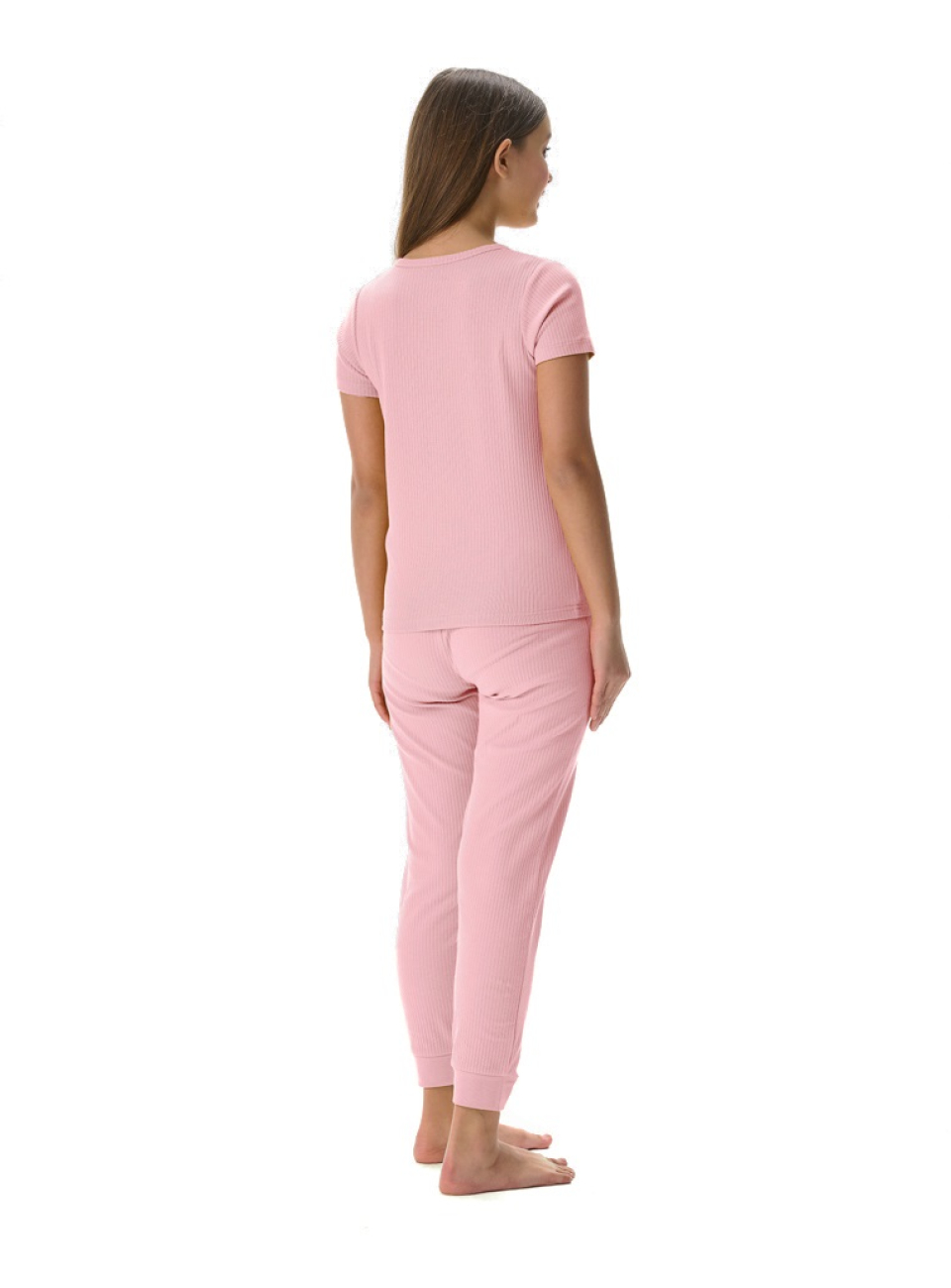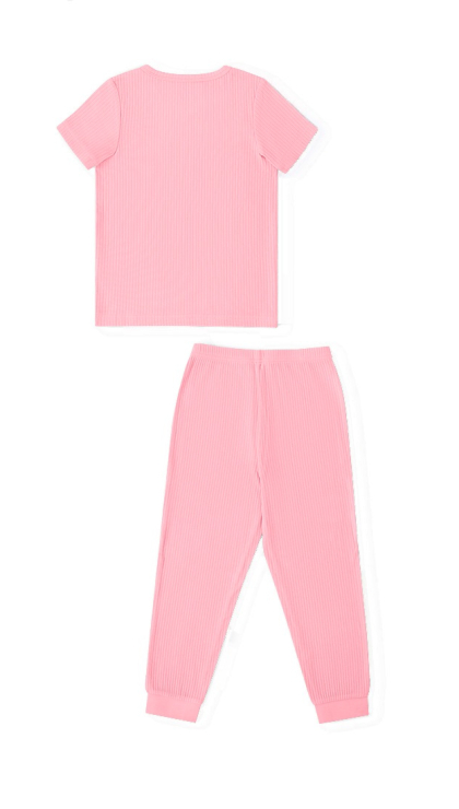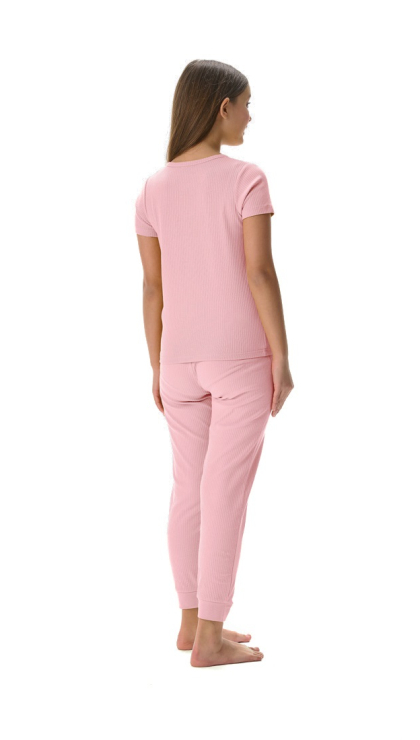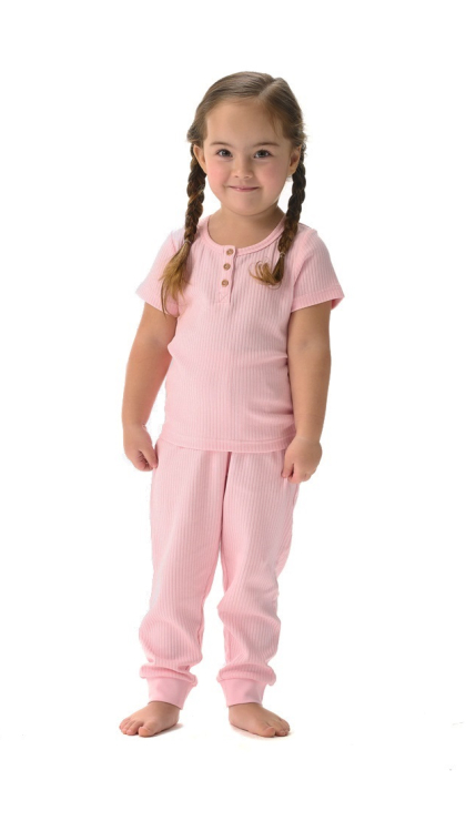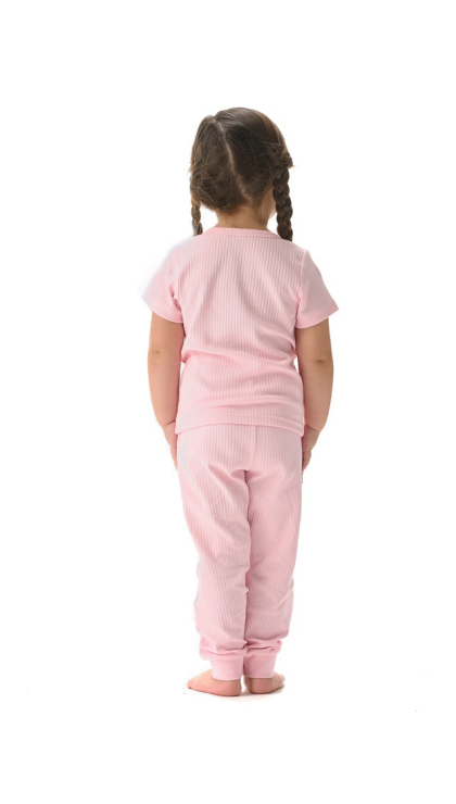Конструктивные особенности: ● Пижамный комплект ● Короткий рукав ● Округлый вырез горловины с застежкой на пуговицы ● Брюки на резинке ● Эластичное полотно в рубчик