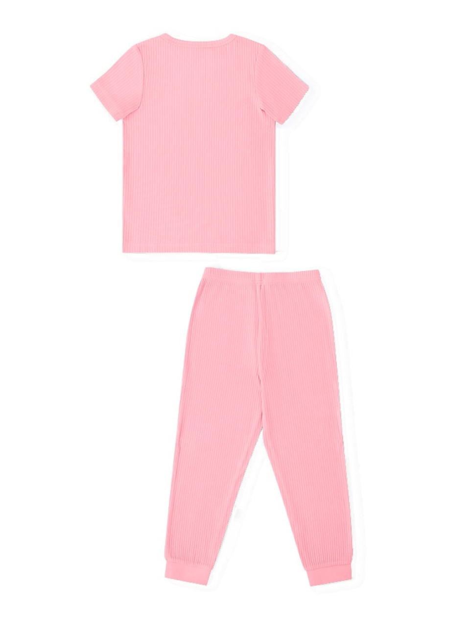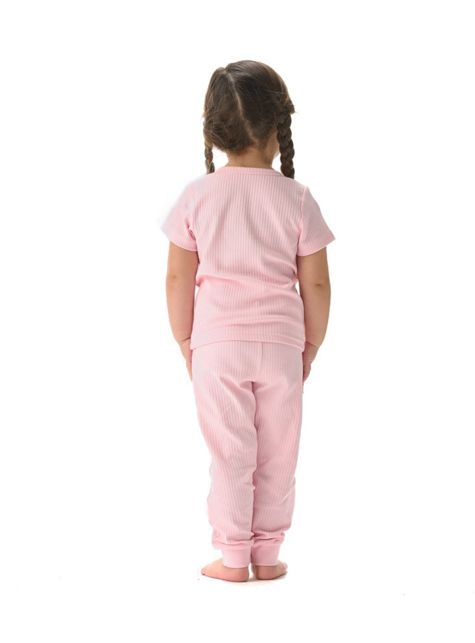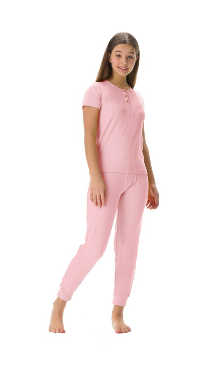 Конструктивные особенности: ● Пижамный комплект ● Короткий рукав ● Округлый вырез горловины с застежкой на пуговицы ● Брюки на резинке ● Эластичное полотно в рубчик
