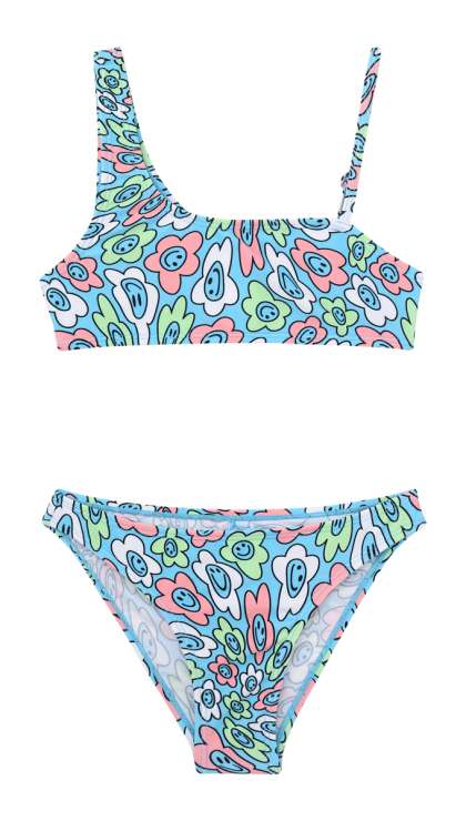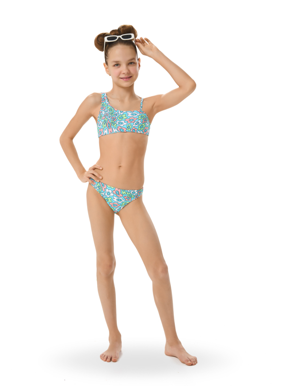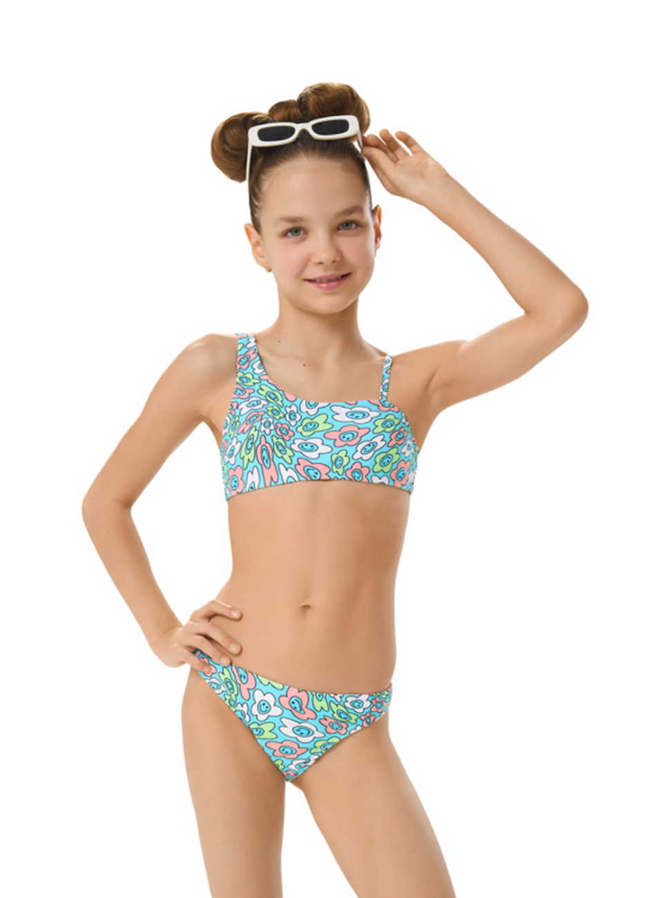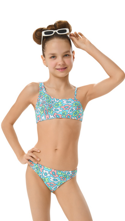 Купальный костюм для девочек Айка это удобный топ и бикини в оригинальном ярком дизайне. Эффектная и удобная модель для активного отдыха на пляже и у бассейна.
