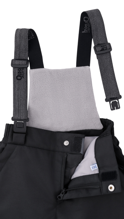 ● Карманы на молнии с листочкой ● Застежка - молния, с кнопкой и липучкой ● Резинка по талии ● Лямки съемные, со спинкой ● Снего-ветрозащитные муфты с антискользящей резинкой ● Усиления тканью Oxford в местах особого износа ● Световозвращающие элементы
