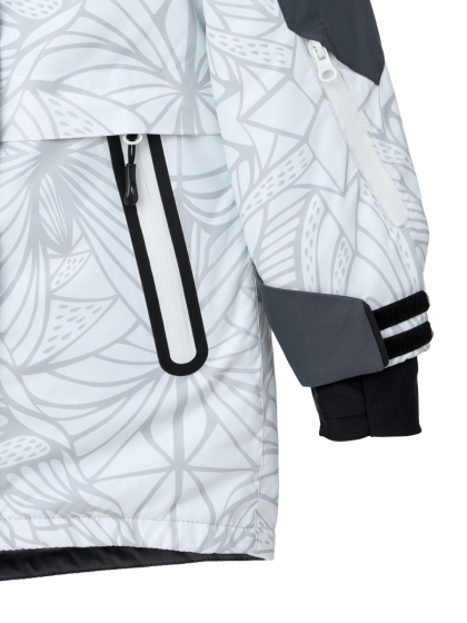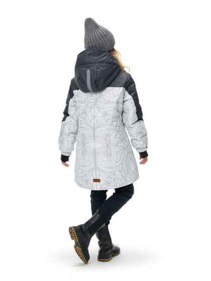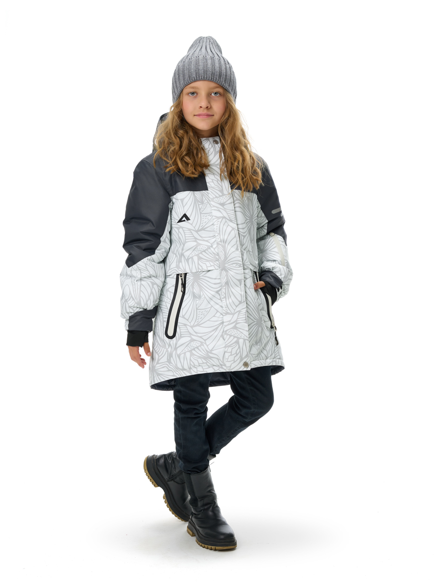 Прямой силуэт настраивается утяжкой по талии для идеальной посадки. Втачные рукава с внутренними эластичным манжетам с отверстием для большого пальца отлично фиксируются и не пропускают холод. Низ рукава регулируется по размеру запястья утяжкой на липучке.