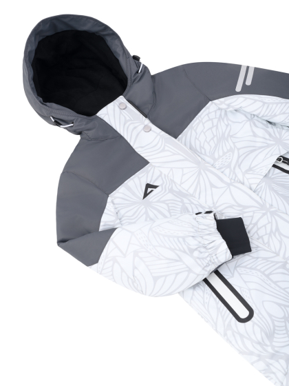 Снего-ветрозащитная юбка с антискользящей резинкой предотвращает попадание осадков и холодного воздуха под куртку. Несъемный капюшон с регулируемой утяжкой по лицевому краю обеспечивает плотное прилегание, а слитный с ним воротник дополнительно согревает шею.