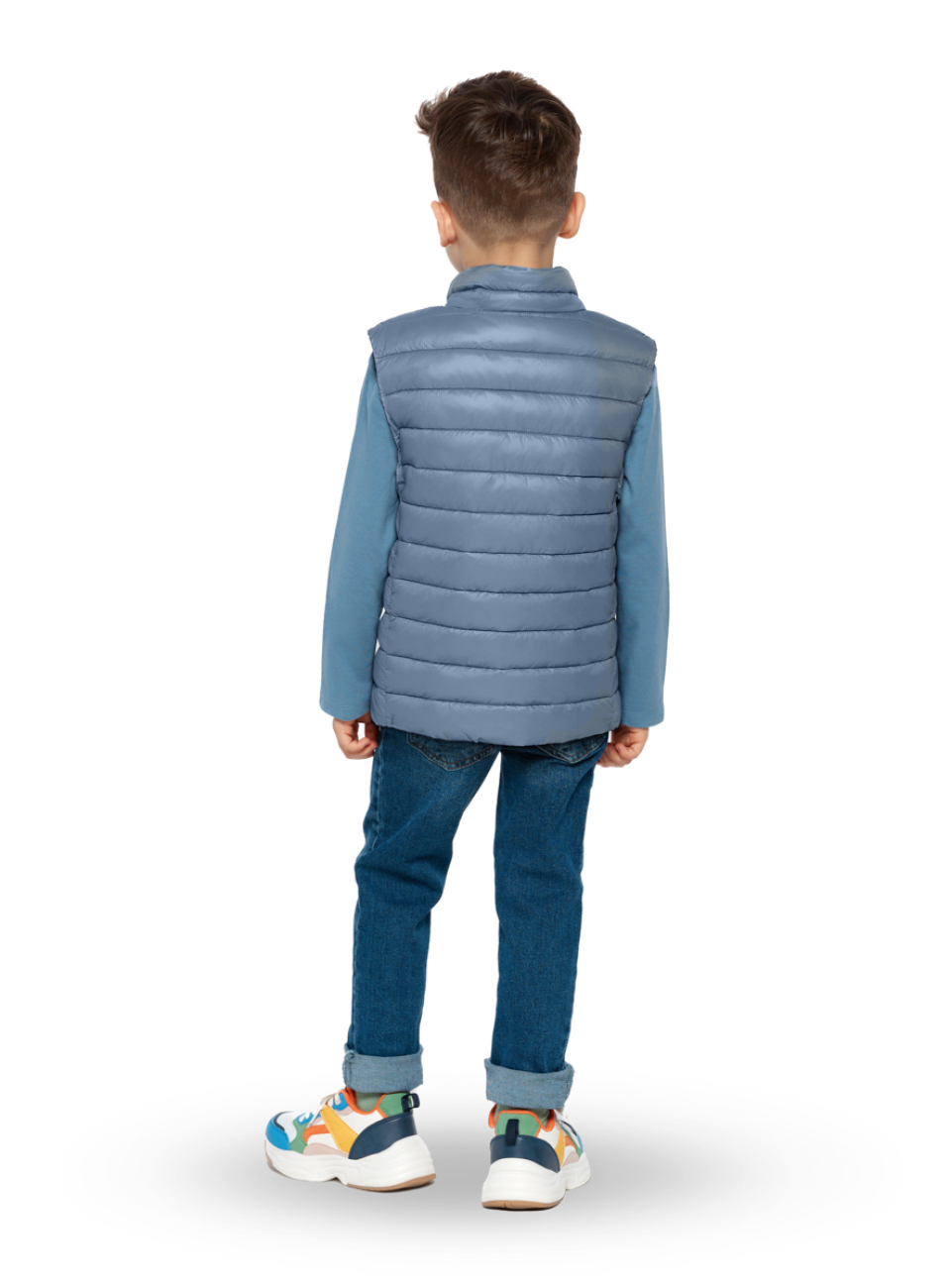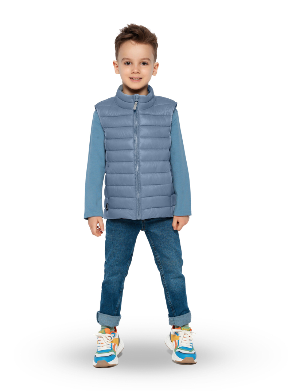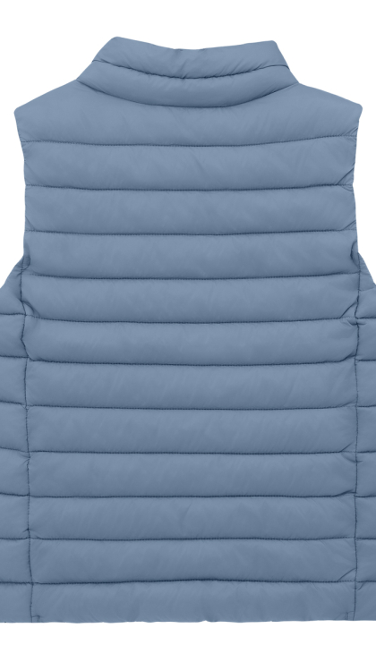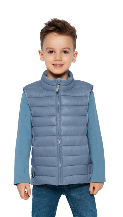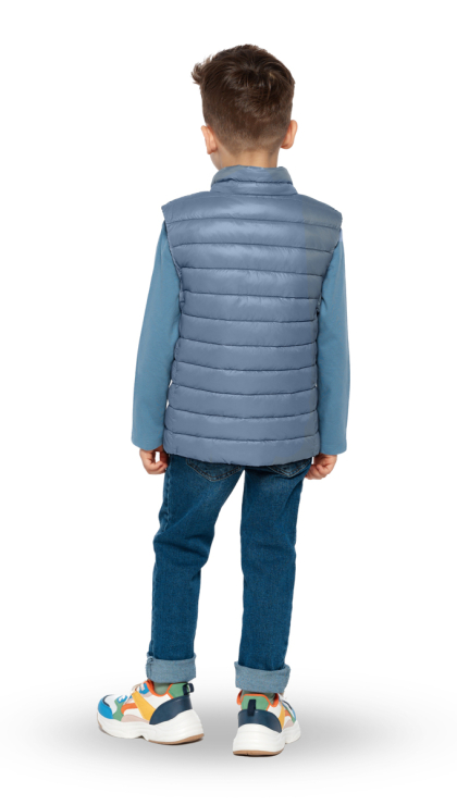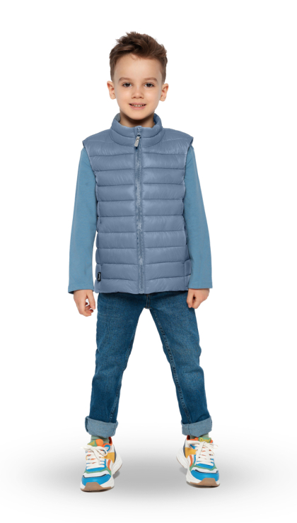Детский теплый жилет имеет прямой силуэт и стежку строчкой, которые создают современный и лаконичный образ. Фигурная стежка не только придает изделию современный вид, но и предотвращает смещение утеплителя. Воротник-стойка с утеплителем выглядит актуально и надежно защищает шею.