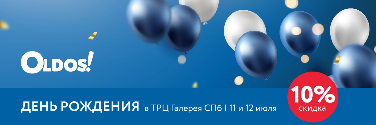 - 11 и 12 июля 2024 года в фирменном розничном магазине OLDOS, расположенном в ТРЦ Галерея в г. Санкт-Петербурге, при покупке предоставляется дополнительная последовательная скидка на всю сумму чека в размере 10% (при наличии других скидок данная скидка применяется последней).